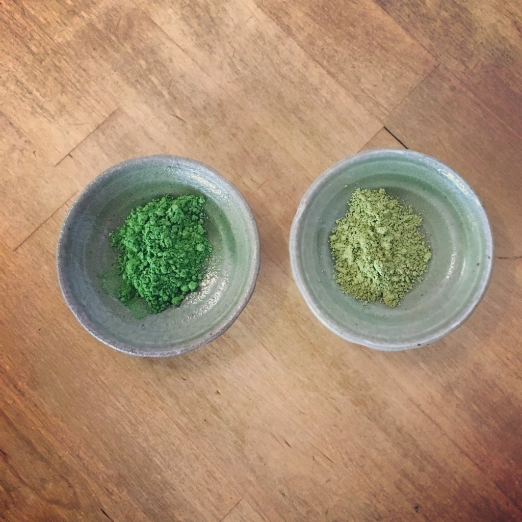 (Kuvassa oikealla: Moga matcha, vasemmalla: tenchasta tehty matcha)